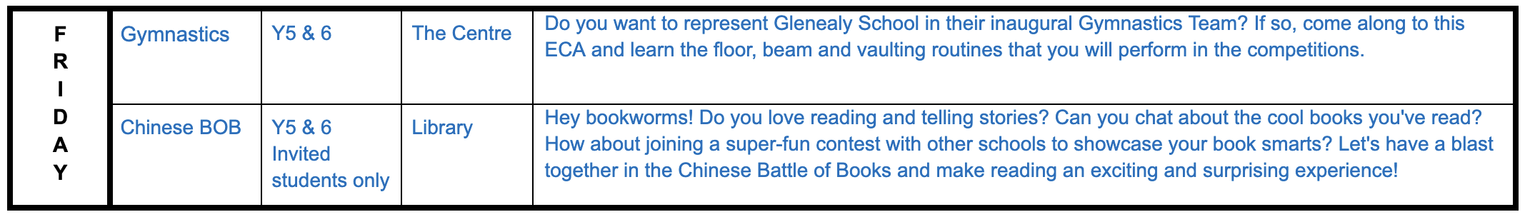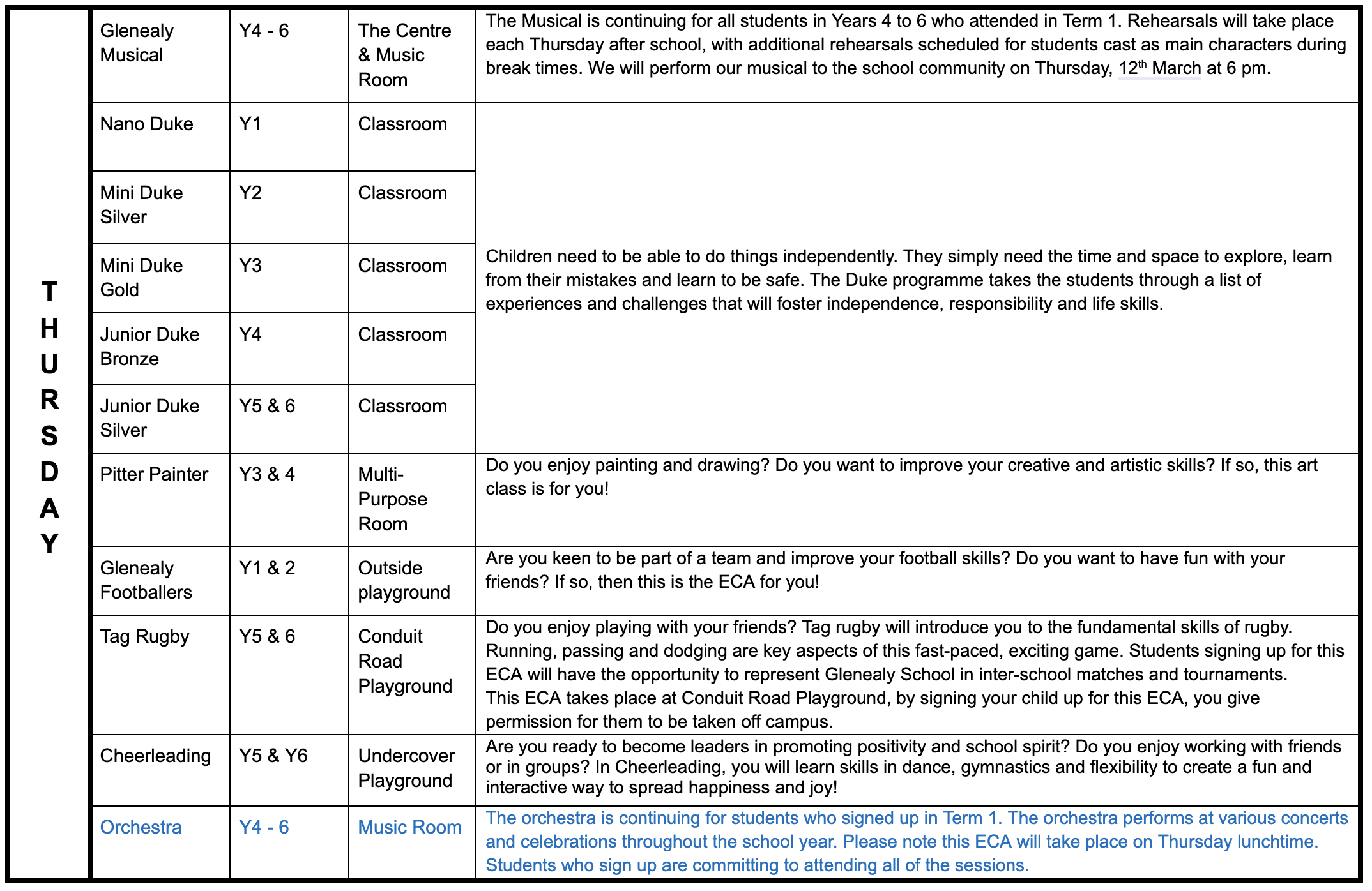 Students staying for Glenealy School-run ECAs will be supervised by a teacher until the start of their ECA. They may wish to bring a small snack to eat after school.